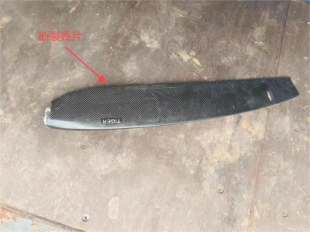 经调查现场确认,双人轮式动力伞螺旋桨三片叶片中的其中一片断裂,断裂残片掉落在距离事故现场东南方向约10米处草坪处绿化带内。